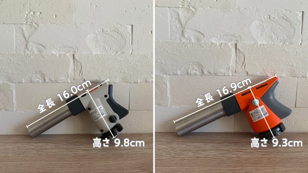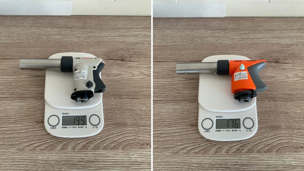 長さは炙りの達人Ⅱ<アウトドアトーチバーナーⅡ、重量は炙りの達人Ⅱ>トーチバーナーⅡという結果でした。
