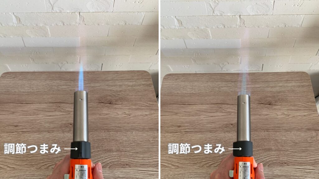 炙りの達人Ⅱ、アウトドアトーチバーナーⅡどちらにも炎の形状を変える調節つまみがあり、尖った炎と柔らかい炎に変えることができます。