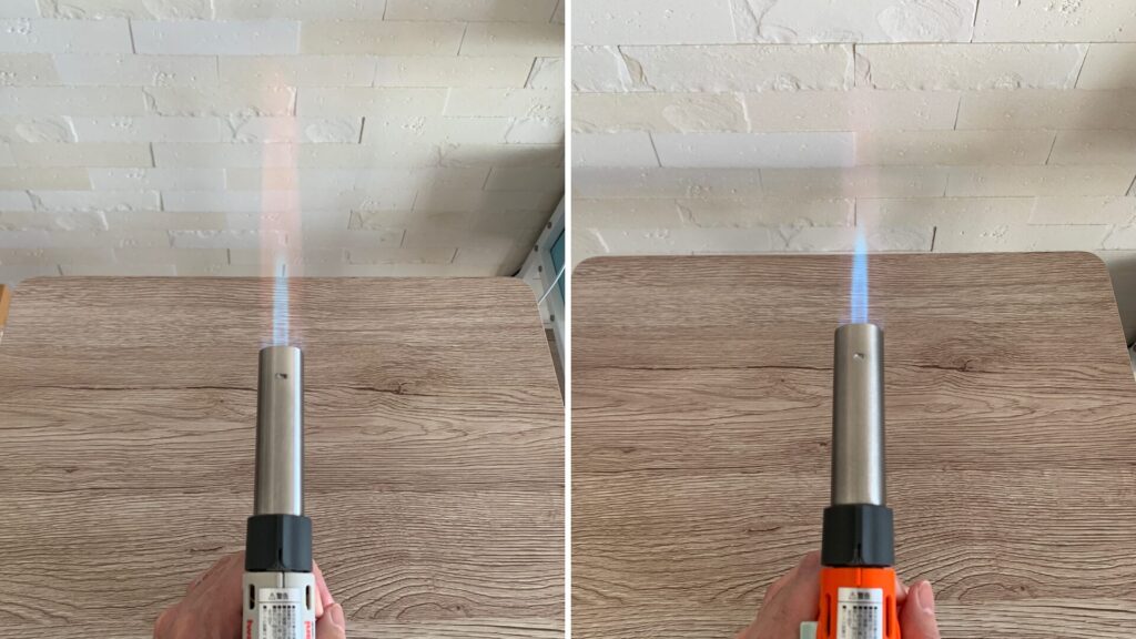 尖った炎に大きな違いは感じることはできませんでしたが、炙りの達人Ⅱの柔らかい炎はアウトドアトーチバーナーⅡと比較してよりゆらゆらと広がる炎の形状をしていました。
