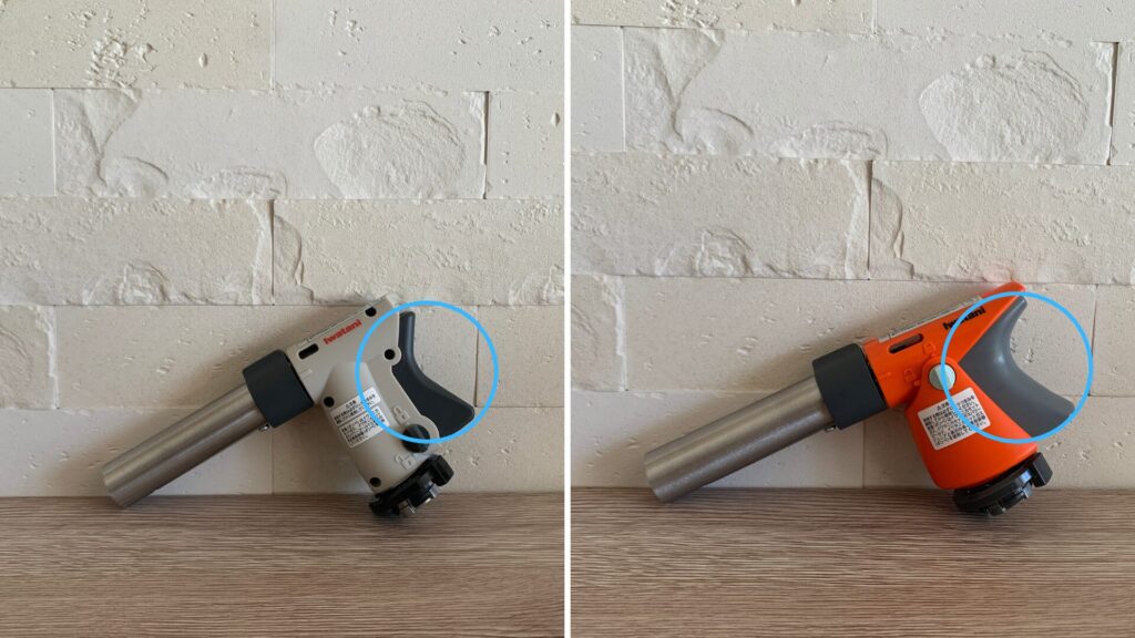 炙りの達人ⅡとアウトドアトーチバーナーⅡは点火レバーを握ると火がつき、離すと火が消える設計です。