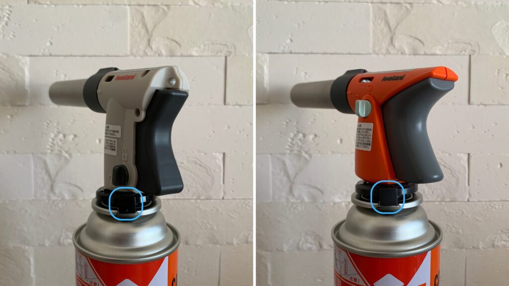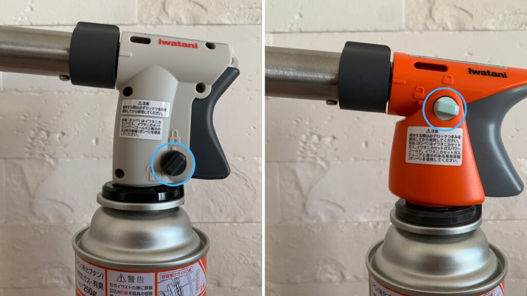 ロックつまみの位置や「Iwatani」のロゴカラーも違いますね。