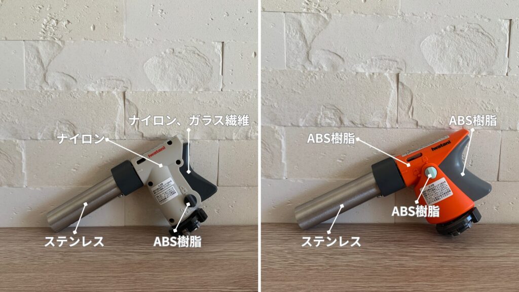 本体素材がナイロン(炙りの達人Ⅱ)かABS樹脂(アウトドアトーチバーナー)というのが大きな違いです。