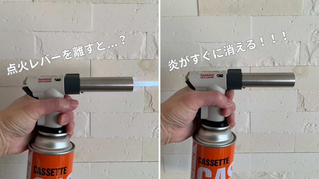 炙りの達人Ⅱは点火レバーを離したあとの残火が残りにくい仕様となっています。