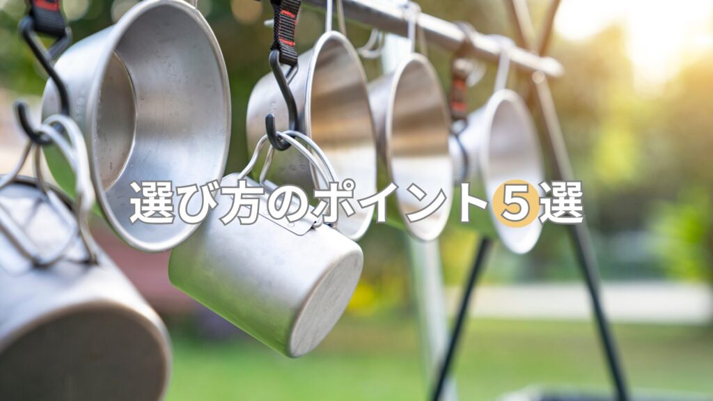 ファミリーキャンプで使うシェラカップの選び方のポイントは「デザイン、サイズ、持ち手の形状、素材、目盛り付」の5点です。