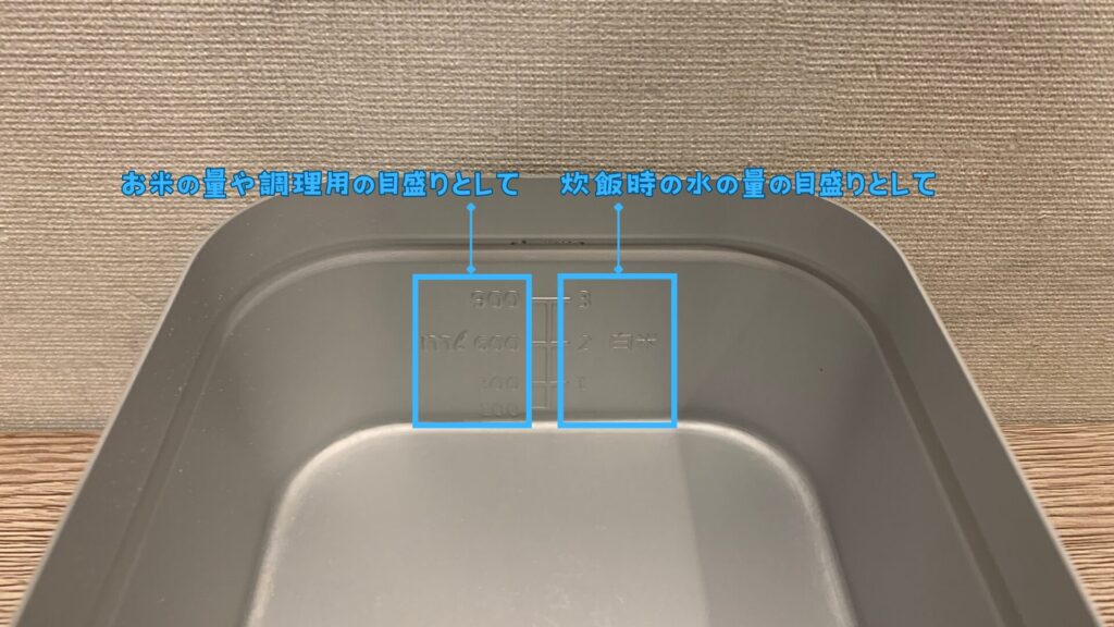 ミリキャンプラージメスティンの目盛りは、左の数値(ml100、300、600、900)はお米の量や調理用として、右の数値(白米1、2、3)は炊飯量に対応する水の量の目安として使います。